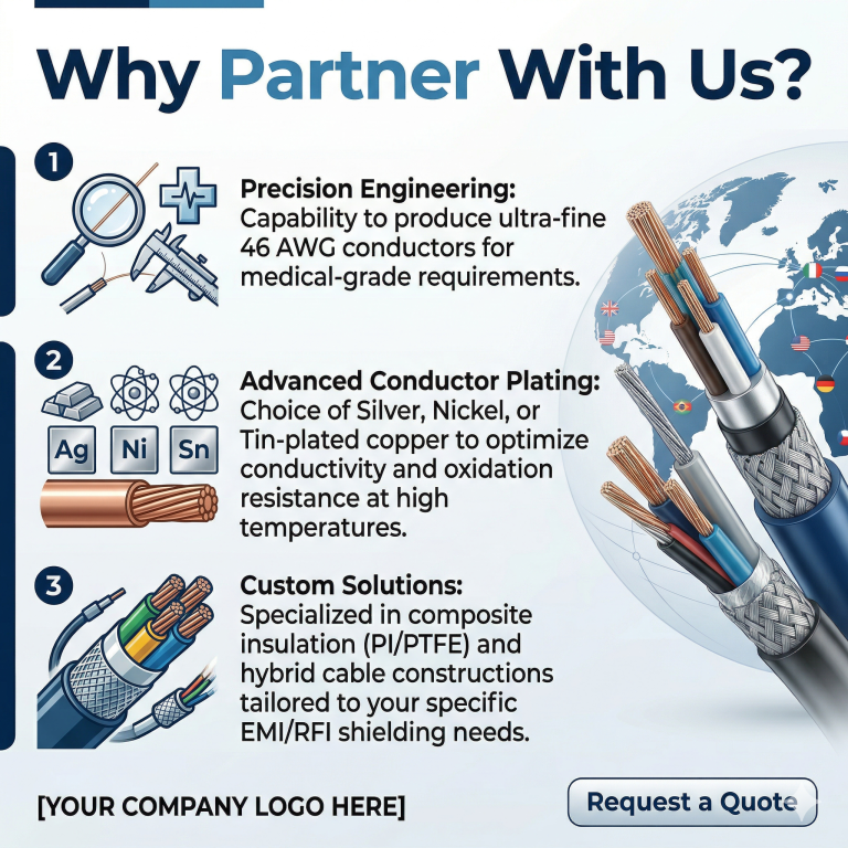Our fluoropolymer-insulated wire portfolio is designed to meet the most demanding electrical and mechanical requirements. Whether you are dealing with the corrosive environments of chemical processing, the extreme heat of aerospace engines, or the precision requirements of medical imaging, our cables deliver consistent signal integrity and durability.